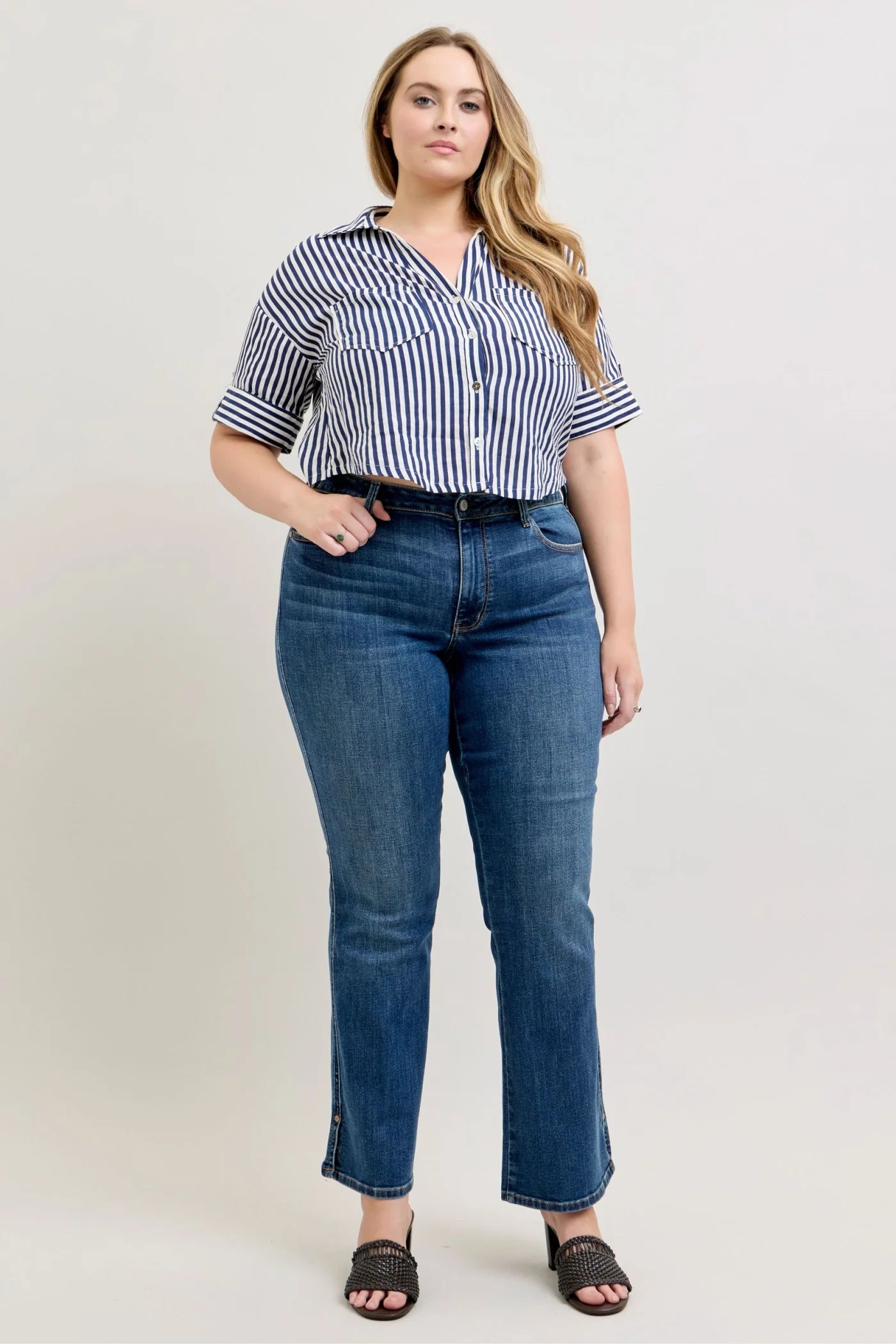 The Mid Rise Bootcut with Cell Phone Back Pocket & Slit combines style, comfort, and practicality. Featuring a mid-rise waist, bootcut leg, and side slit, these pants offer a flattering fit that elongates the leg. The cell phone back pocket adds convenient functionality without compromising the sleek silhouette.