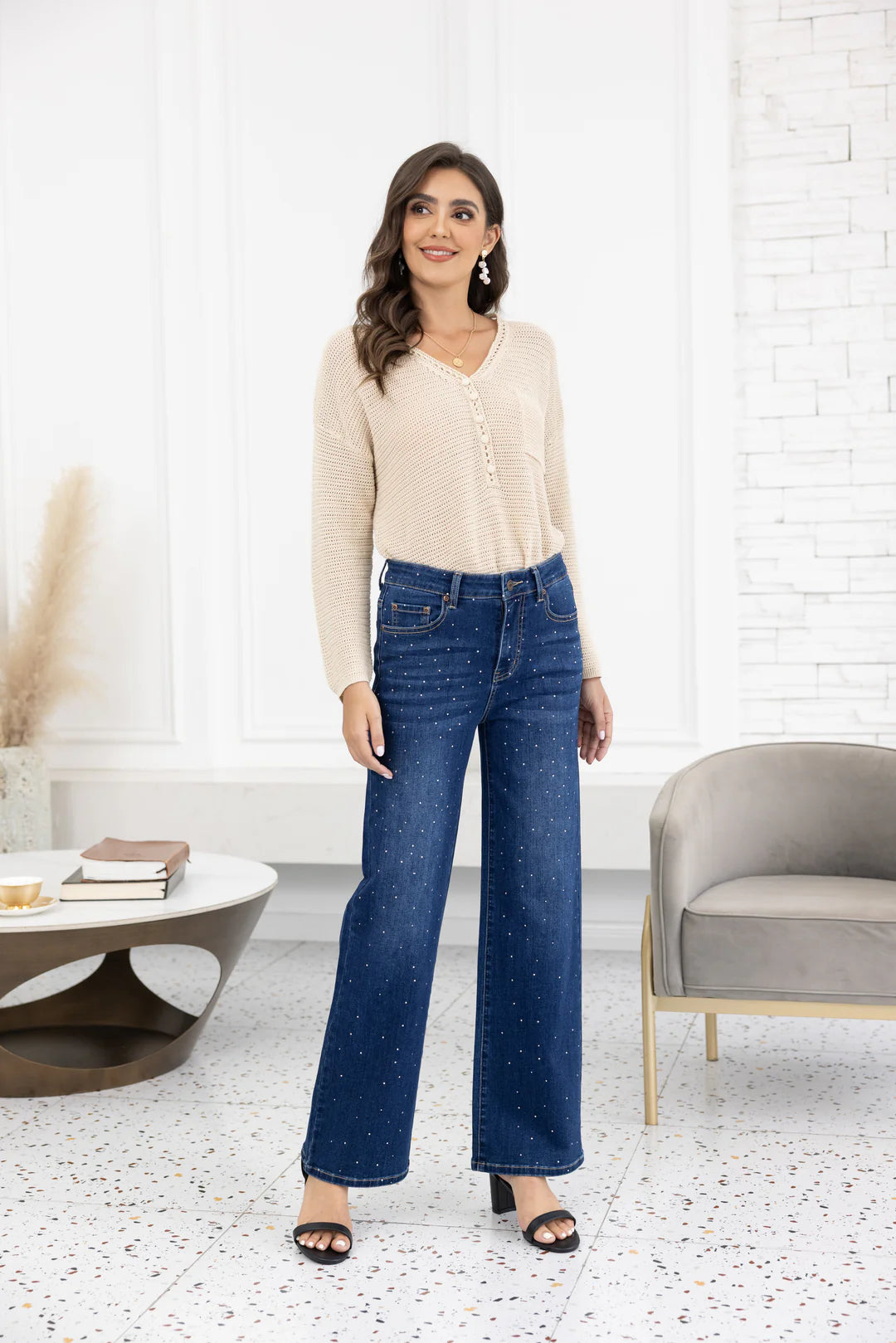 Diamond Bamboo Denim shines with effortless elegance. Crafted from soft, eco-friendly bamboo denim, these ankle-length jeans are adorned with delicate crystal and pearl detailing for a refined, standout look. The flattering wide-leg cut offers all-day comfort and chic versatility, making them the perfect blend of style and sustainability.