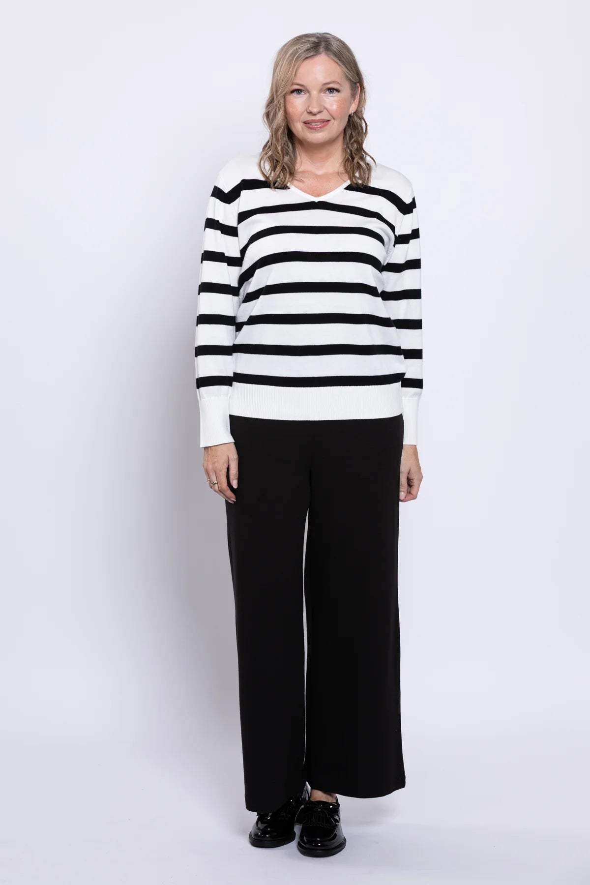 Stay effortlessly stylish in the Breton Stripe Sweater, a classic staple designed with a flattering V-neckline and chic black-and-tan stripes. Finished with ribbed cuffs and hem, this 100% cotton piece is a must-have for everyday comfort and versatile wear.