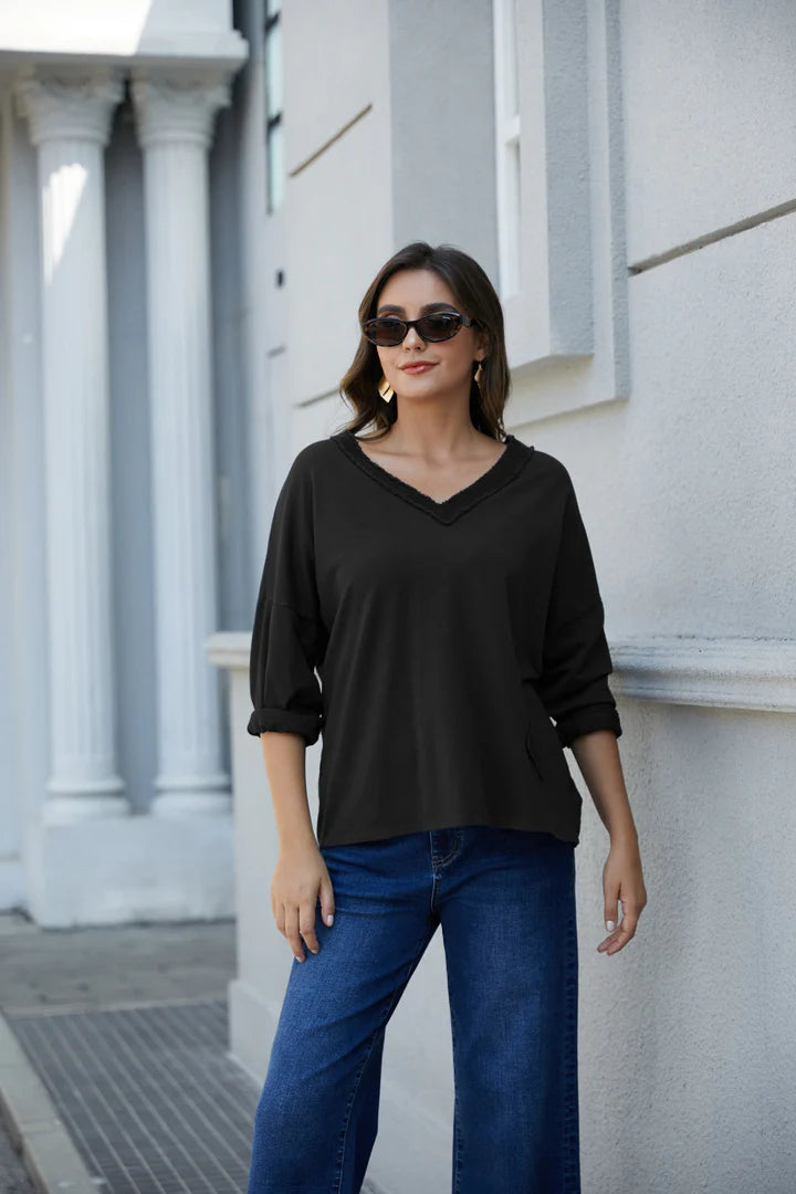Mila’s Sweater is a versatile essential designed for both comfort and style. Crafted from soft French terry, it offers a cosy feel that’s perfect for everyday wear. The fringe v-neckline adds a unique, fashionable touch, while the long sleeves provide warmth for cooler days. A timeless piece that transitions effortlessly from casual to polished looks.