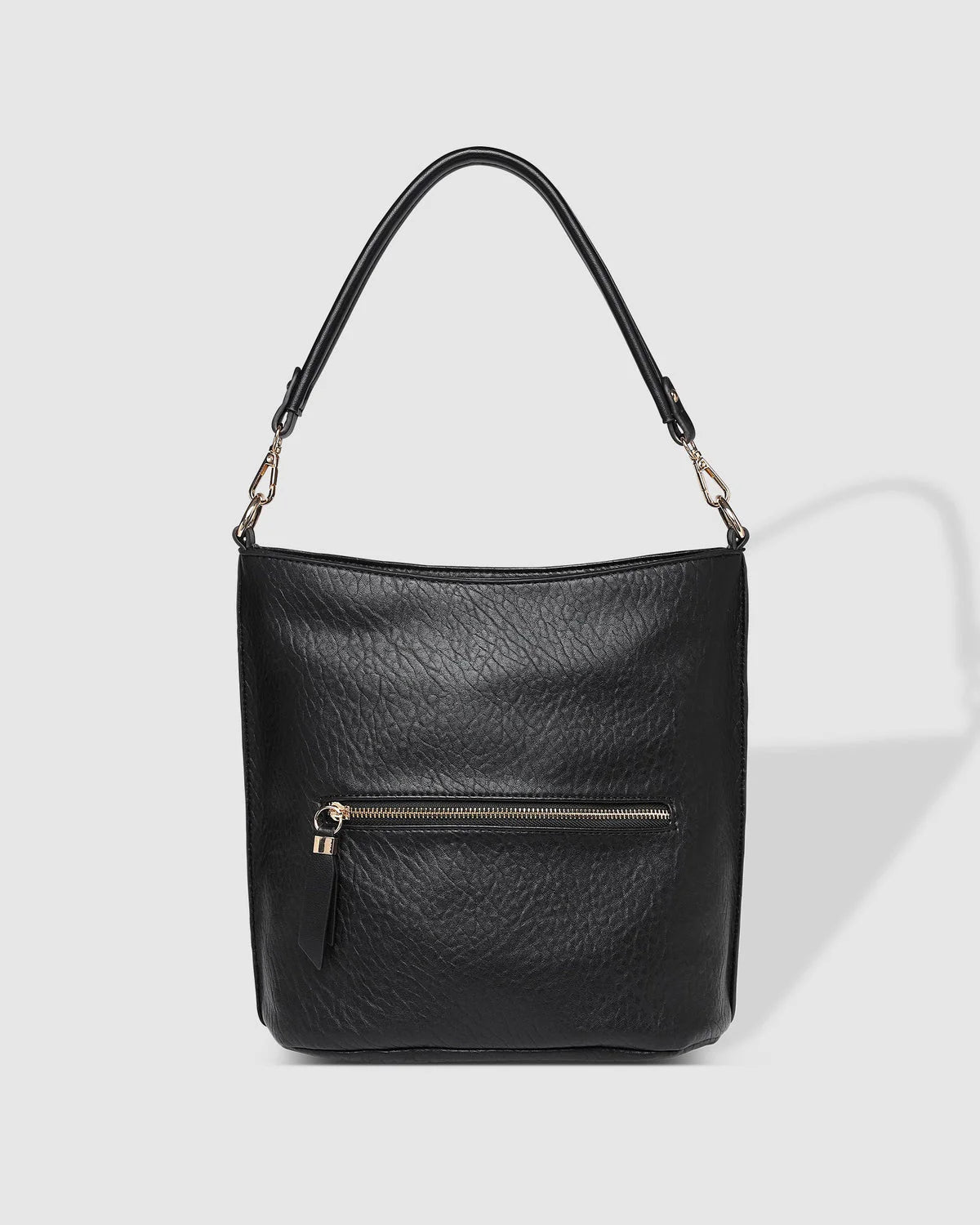 Louenhide Juno Handbag is a sleek, minimalistic bucket bag silhouette featuring textured vegan leather and light gold hardware. This version includes a coordinating logo crossbody strap that is wide and comfortable, plus a bonus small bag that can be used as an organiser or a separate crossbody. Practicality meets style with a spacious interior and an additional internal clutch to help streamline your essentials wherever you go. Carry this casual handbag over the shoulder for a polished look or sling it crossbody with the adjustable strap for hands-free convenience. Paired with jeans, a white tee, and a longline trench coat, this versatile women’s handbag elevates your on-the-go lifestyle.