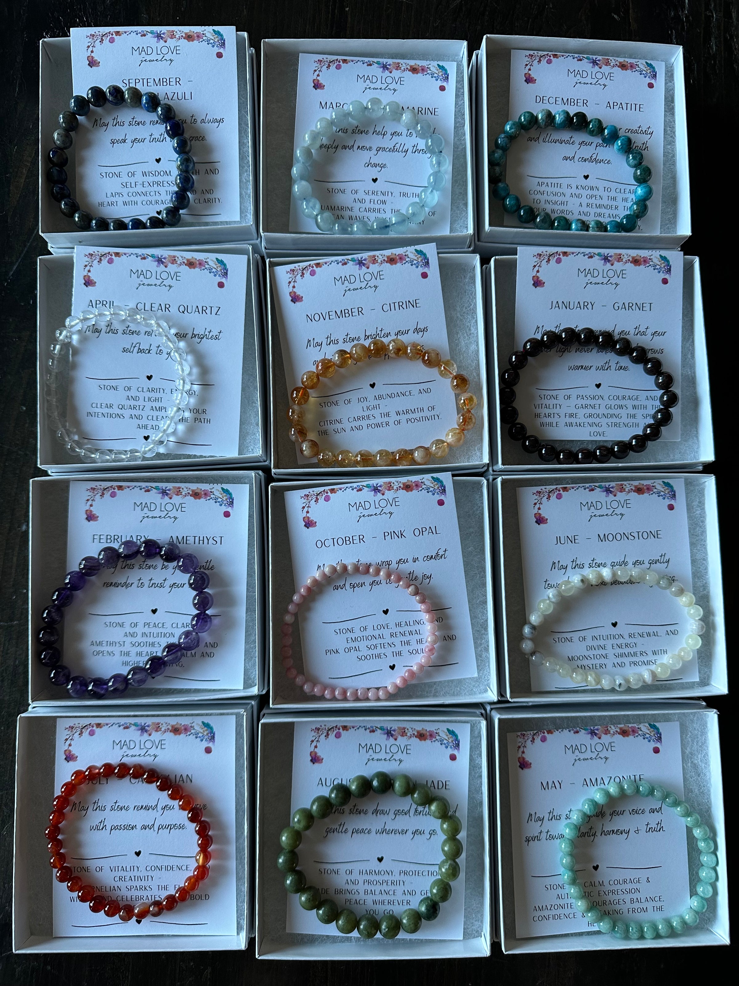 Celebrate every month with the Mad Love Birthstone Bracelets. Each bracelet features a vibrant, hand-selected birthstone that adds a personal touch to any outfit. Made with care and attention to detail, these bracelets are perfect for stacking or wearing alone.