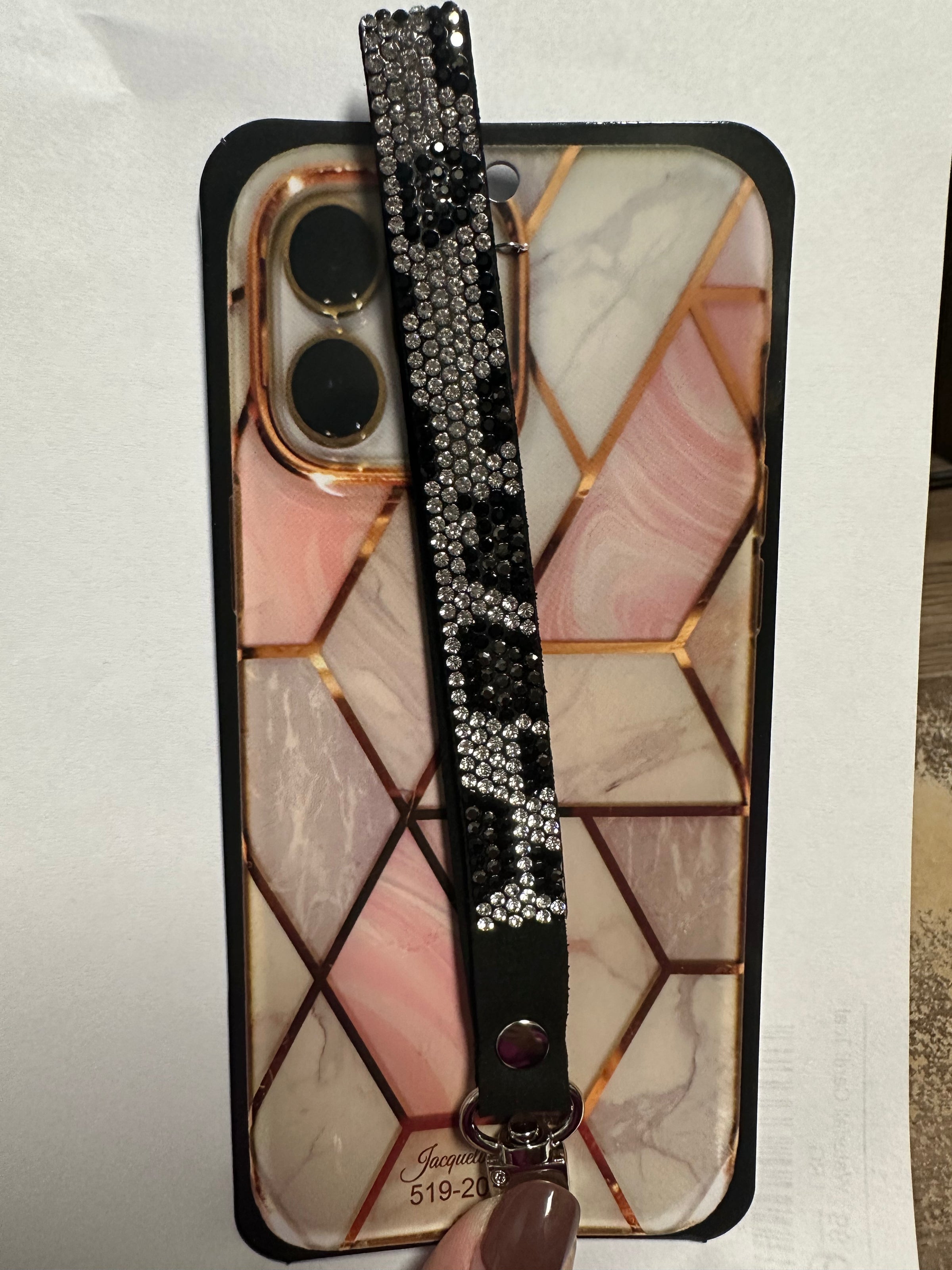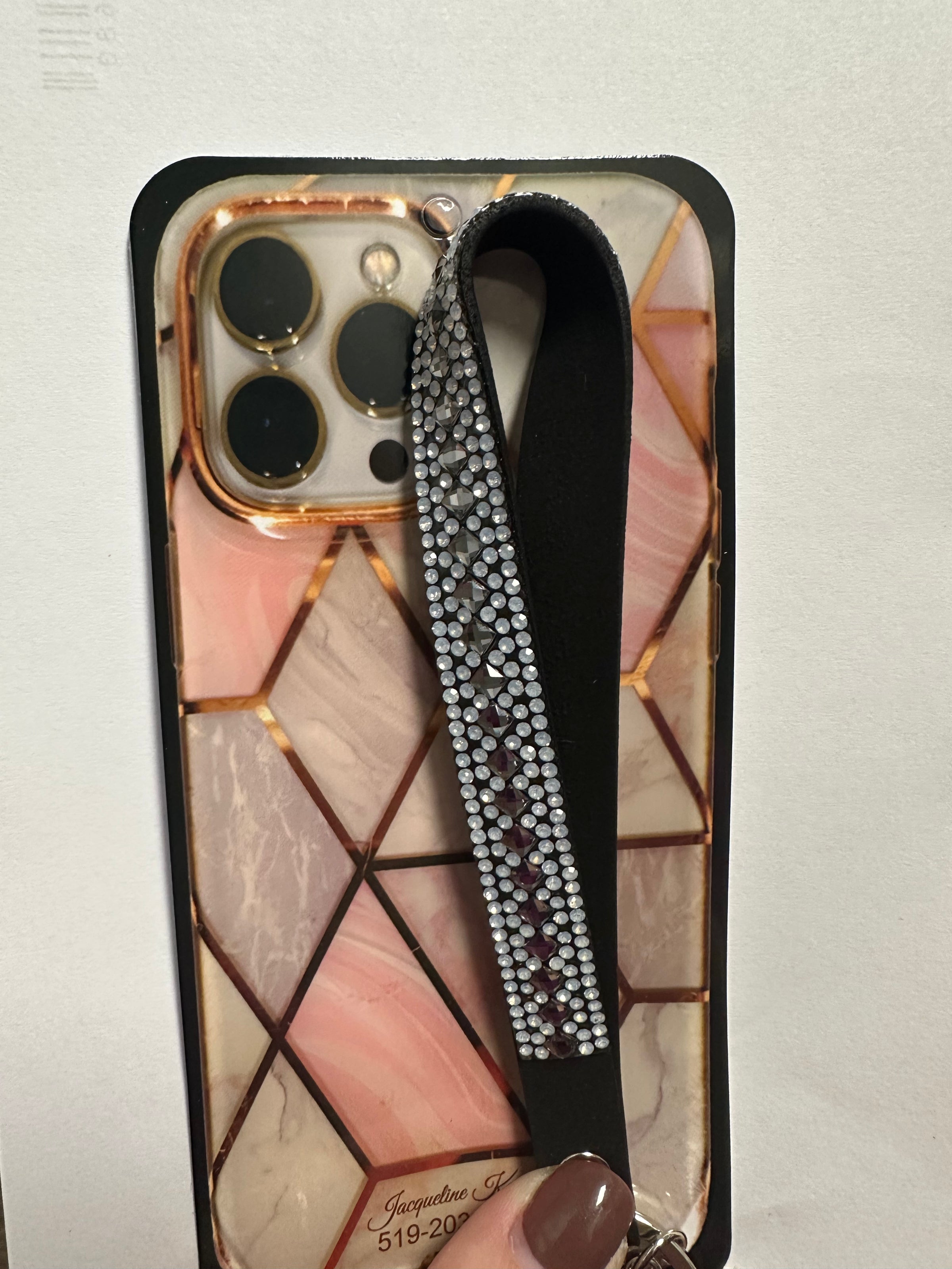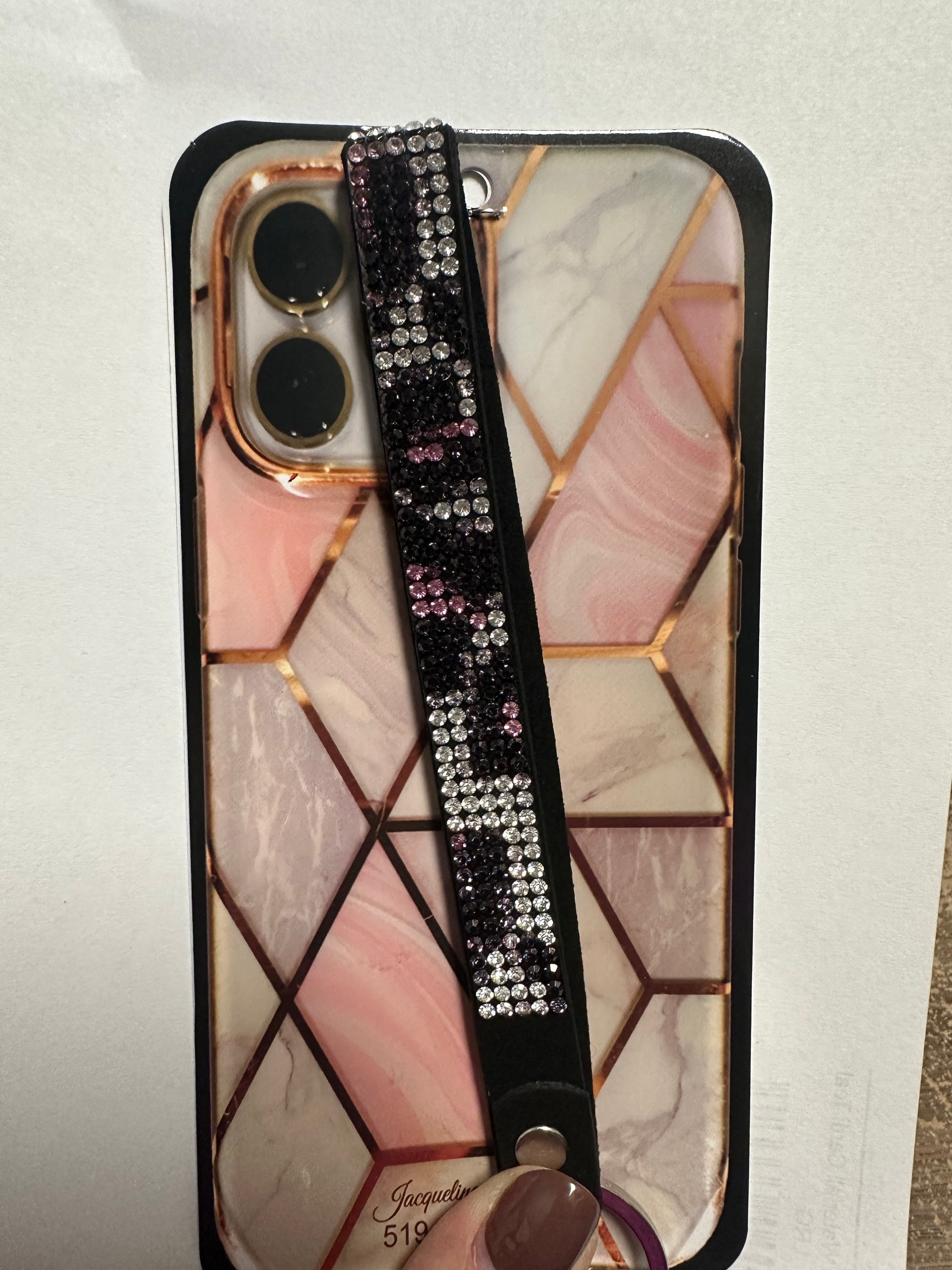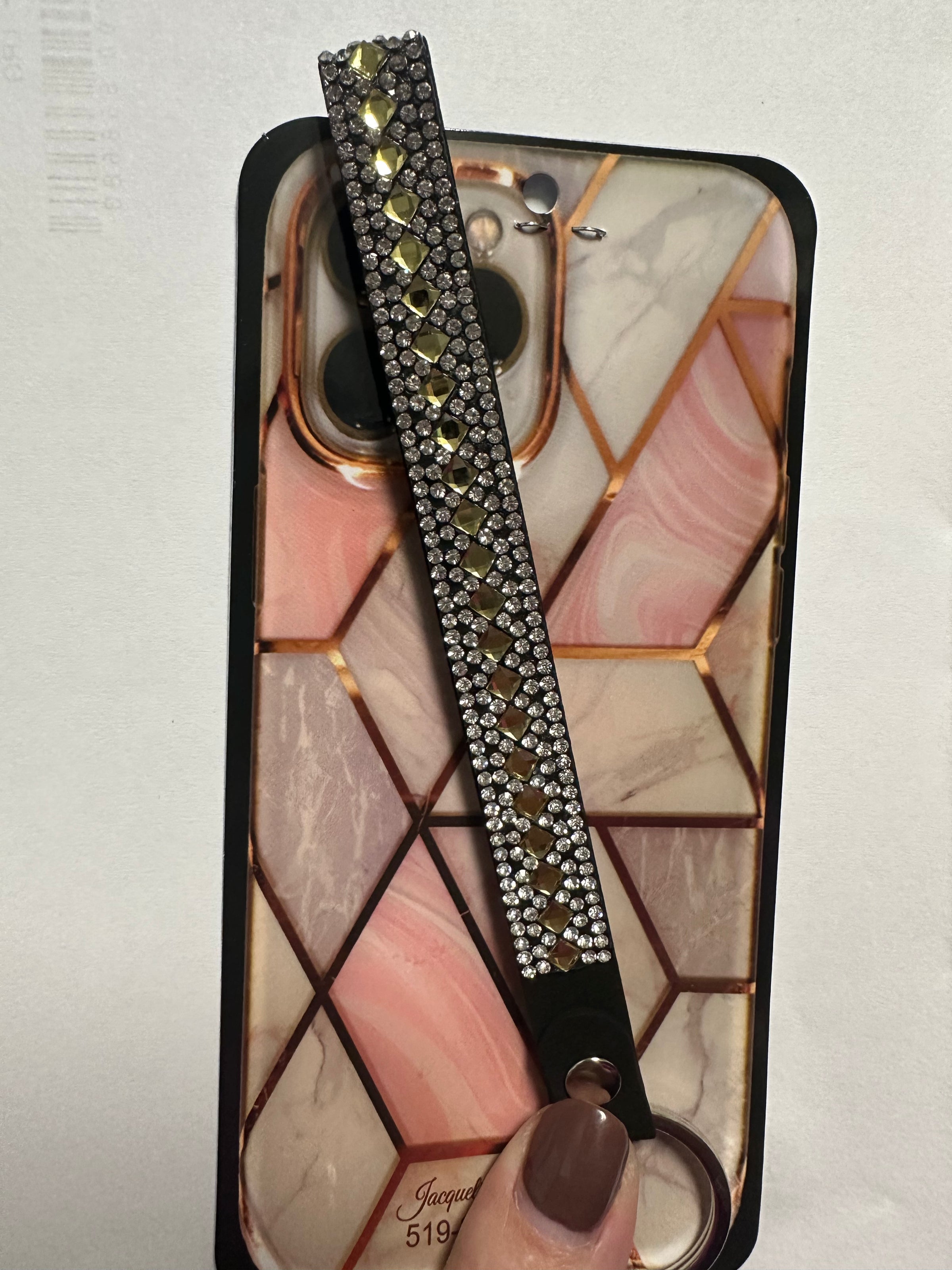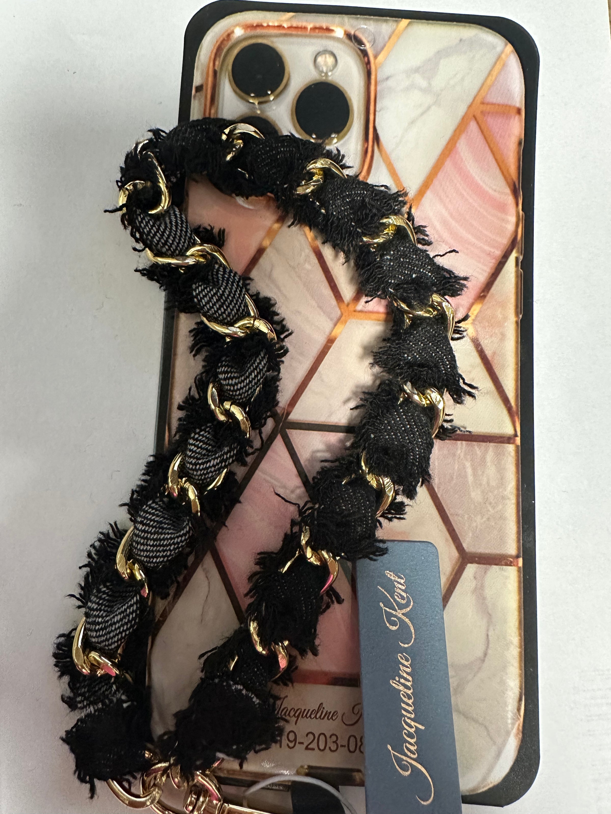 A fashion wristlet for your phone case from Jacqueline Kent. Perfect for on the go women who want to have their phone accessible while multitasking and have their hands free, and for the security of your phone.