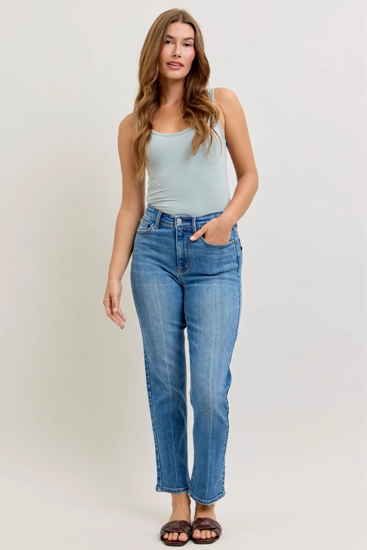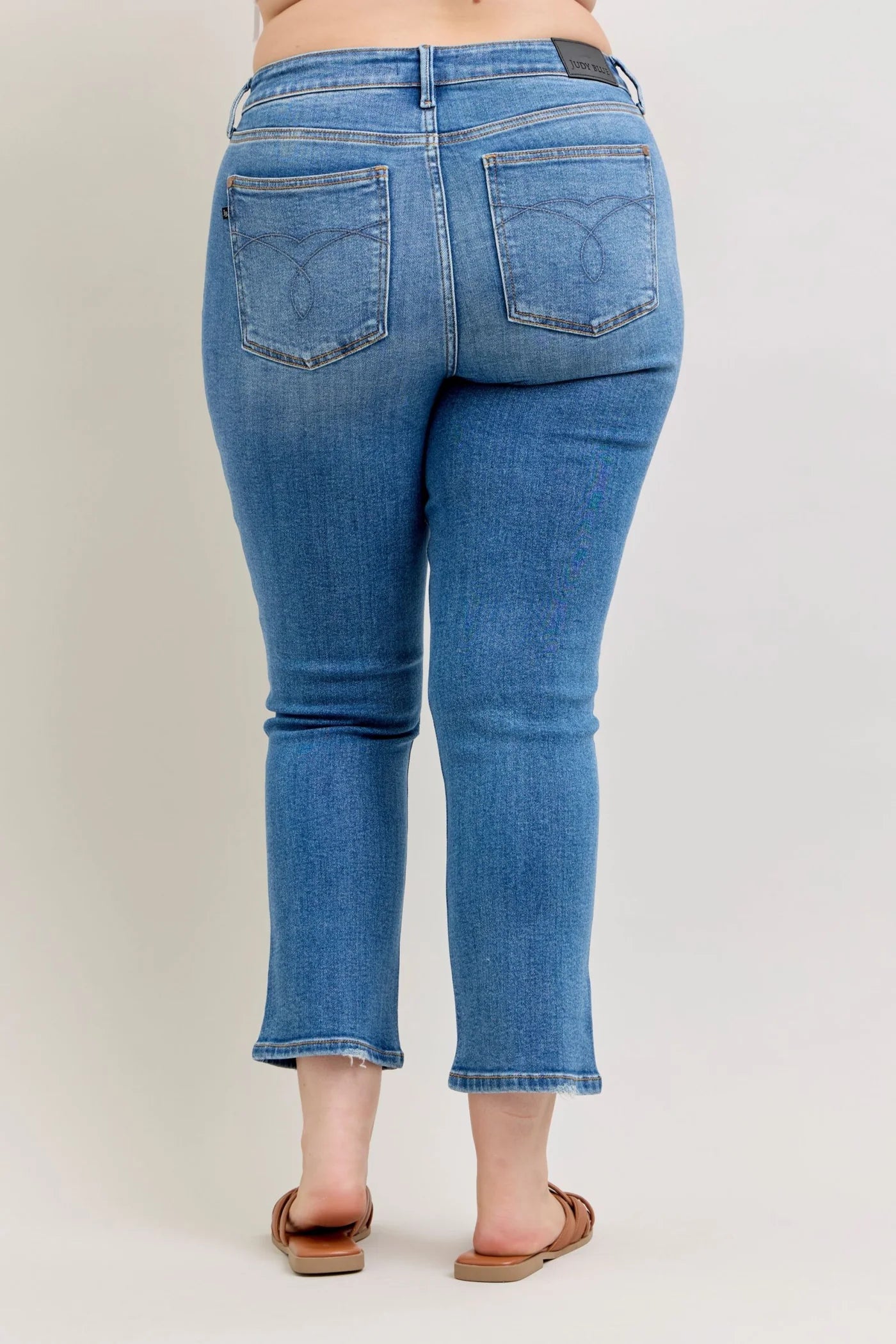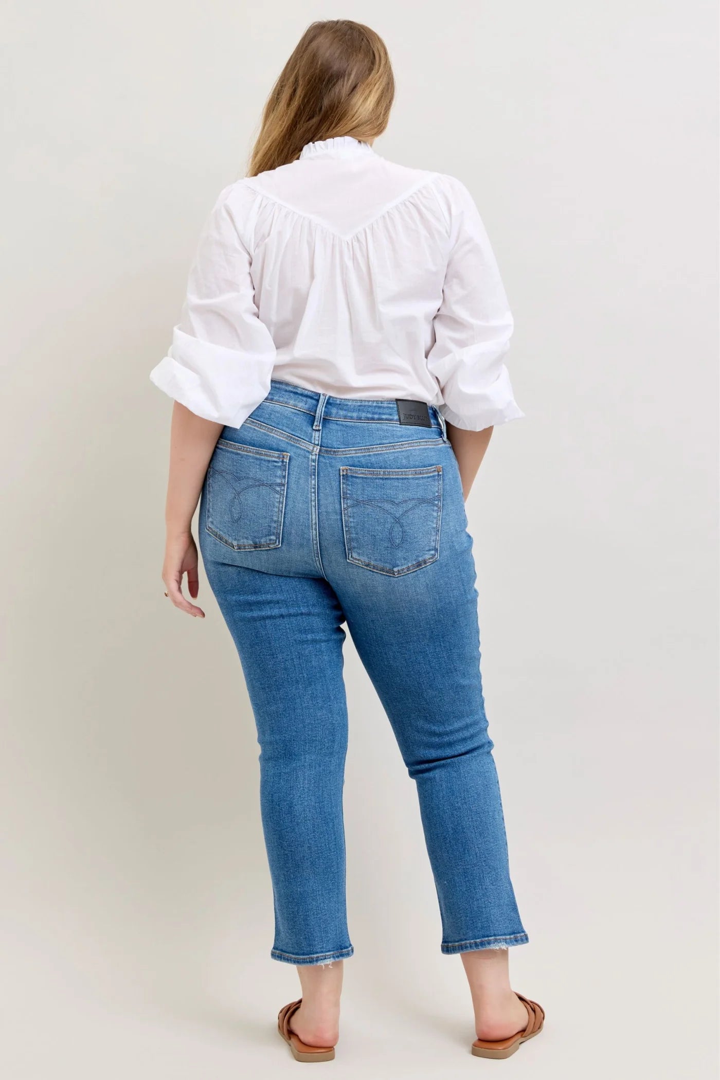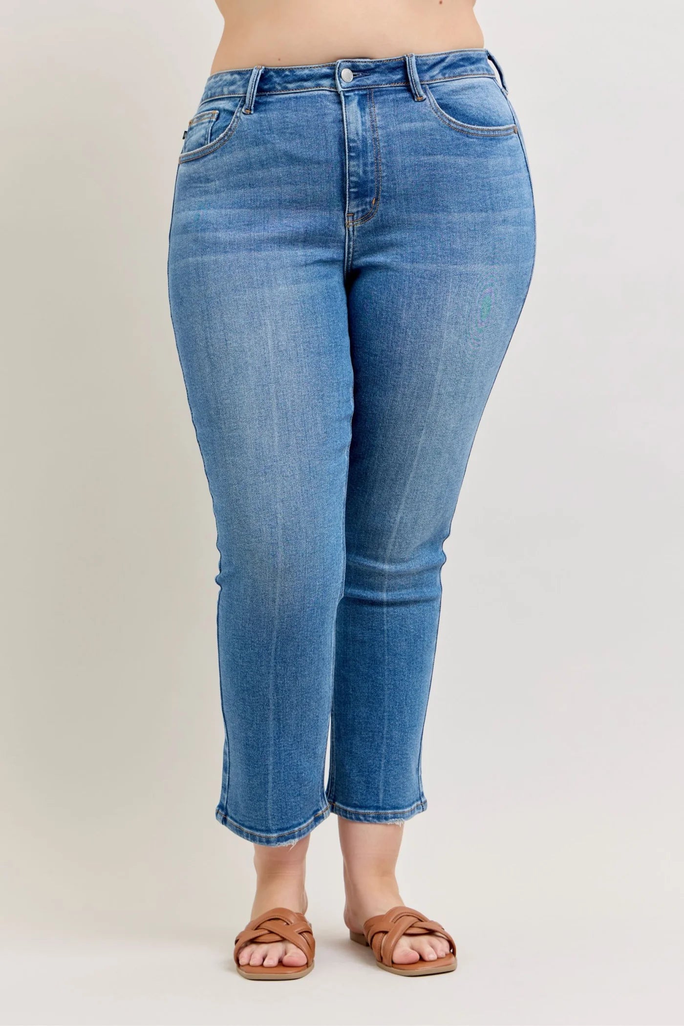 The Judy Blue High Waist Ankle Straight Jeans are a classic denim style with elevated details, making them an easy everyday favourite. Designed in a versatile medium blue wash, these jeans feature a high-rise fit and a timeless straight leg silhouette that hits at the ankle.