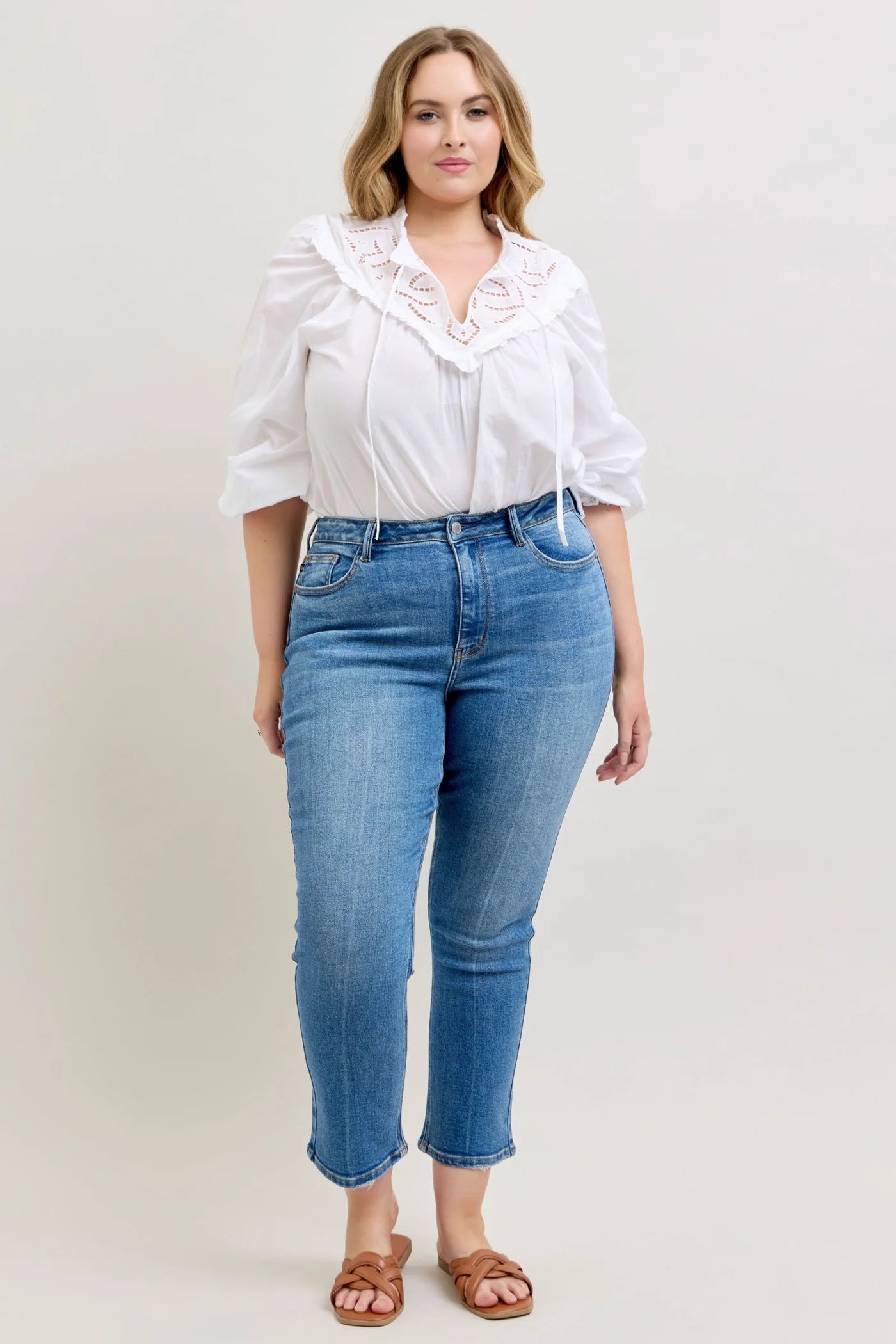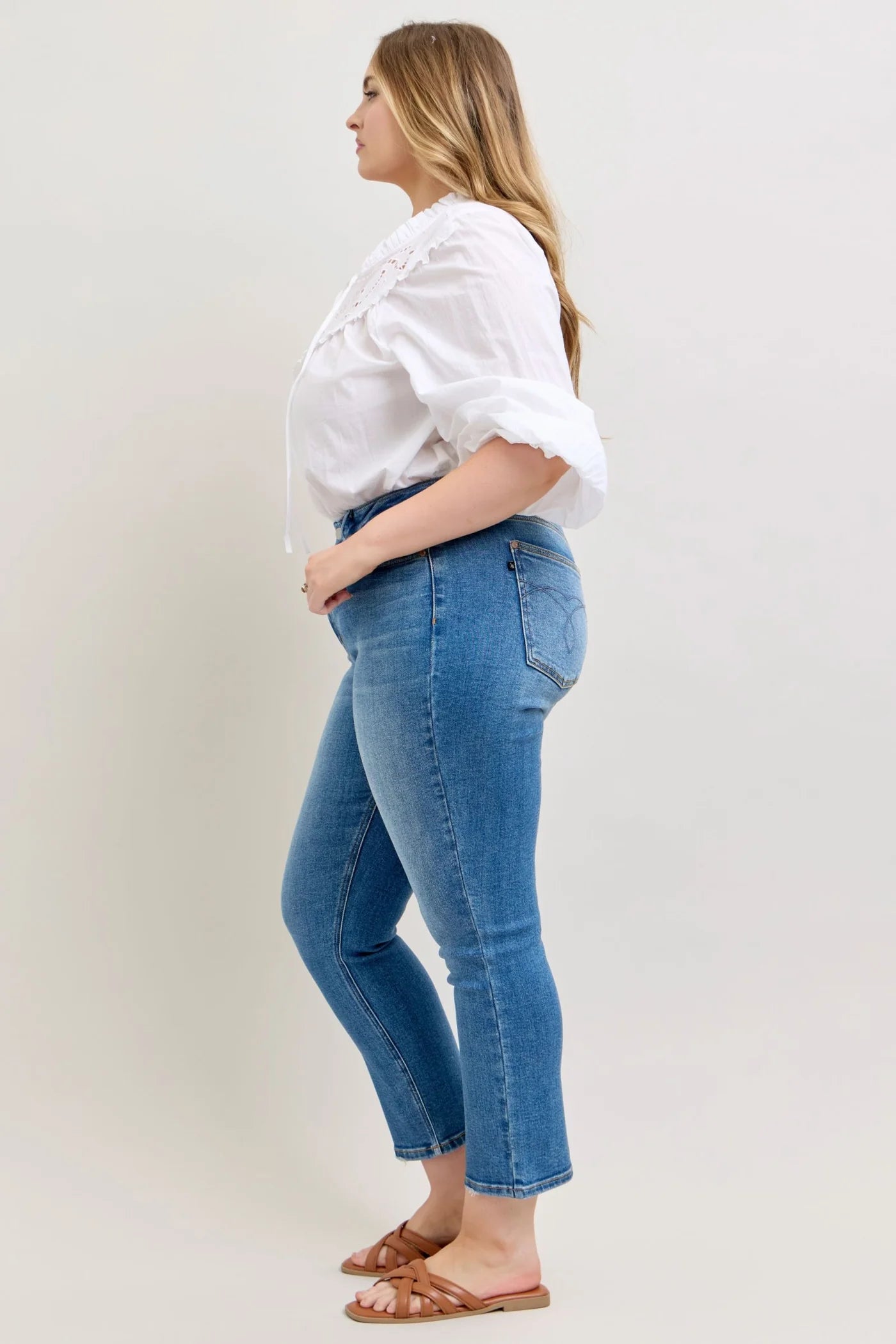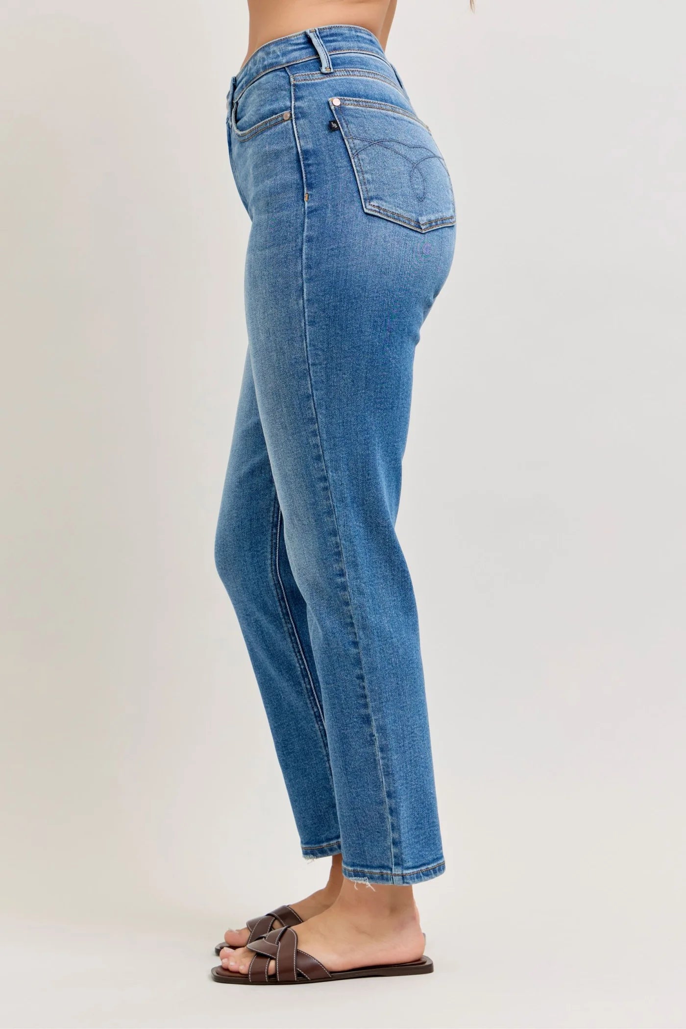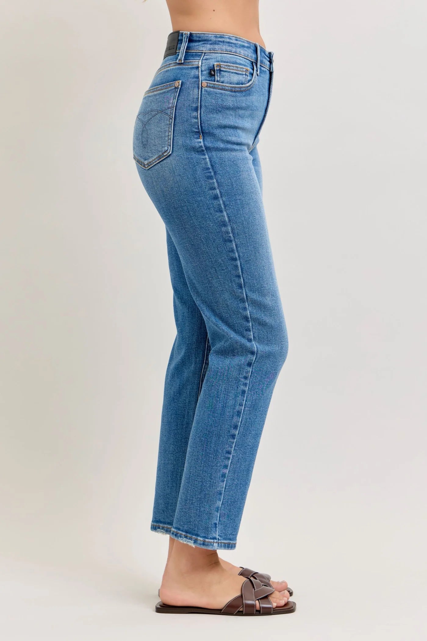 The Judy Blue High Waist Ankle Straight Jeans are a classic denim style with elevated details, making them an easy everyday favourite. Designed in a versatile medium blue wash, these jeans feature a high-rise fit and a timeless straight leg silhouette that hits at the ankle.