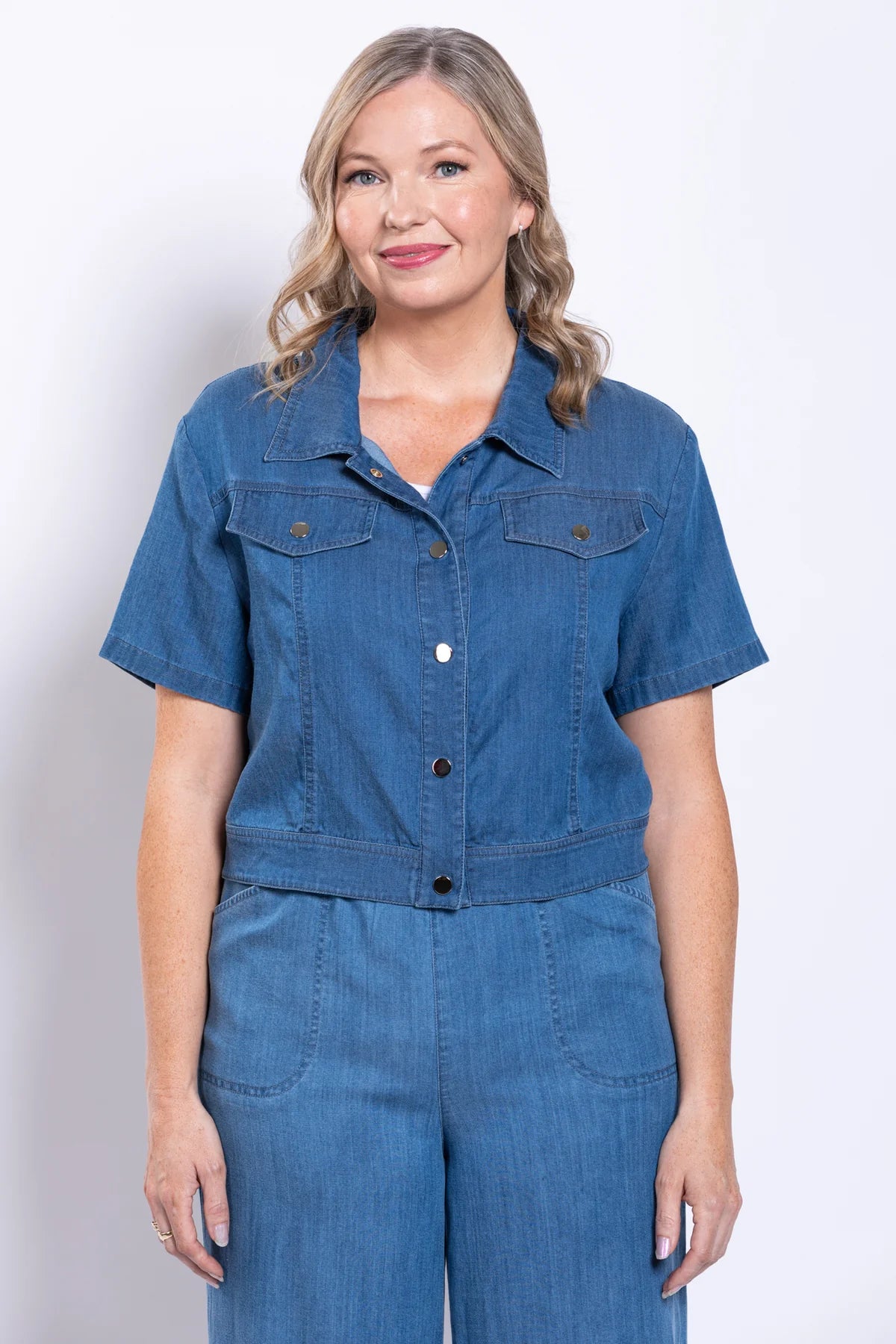 The Lana Jacket crafted from super soft Tencel Denim, features short sleeves,  a cropped fit. waistband and double chest pockets