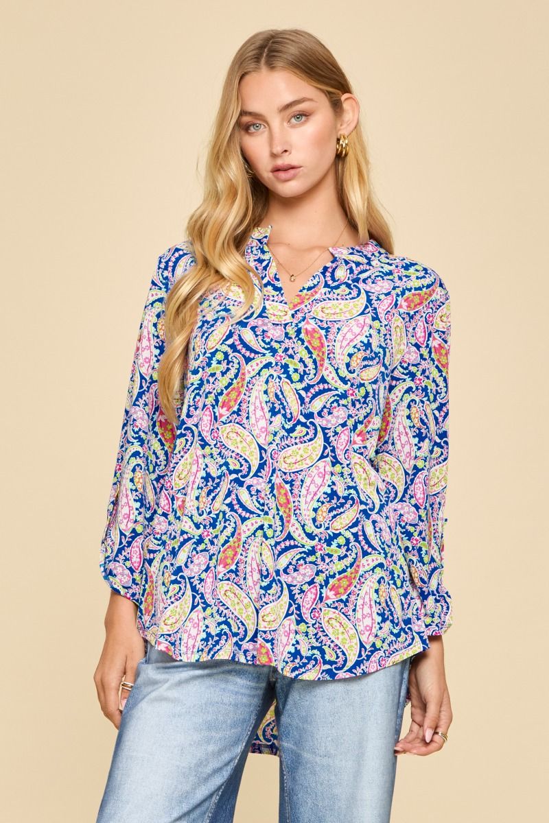 Designed with a mandarin collar, 3/4 sleeves featuring brand-new custom gold tabs, and a relaxed high-low silhouette, this top combines modern detailing with a versatile, comfortable fit.